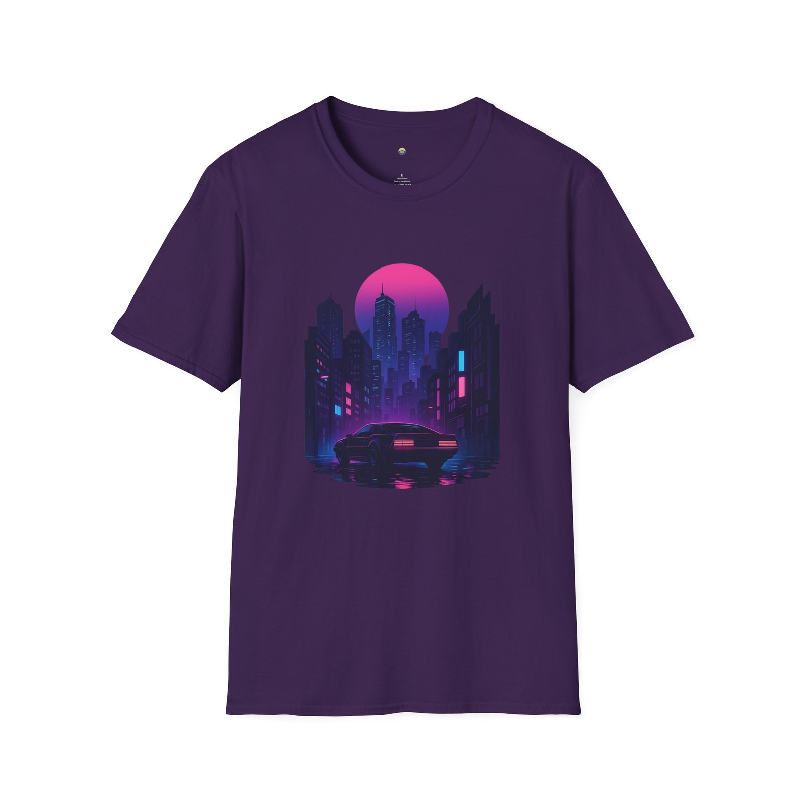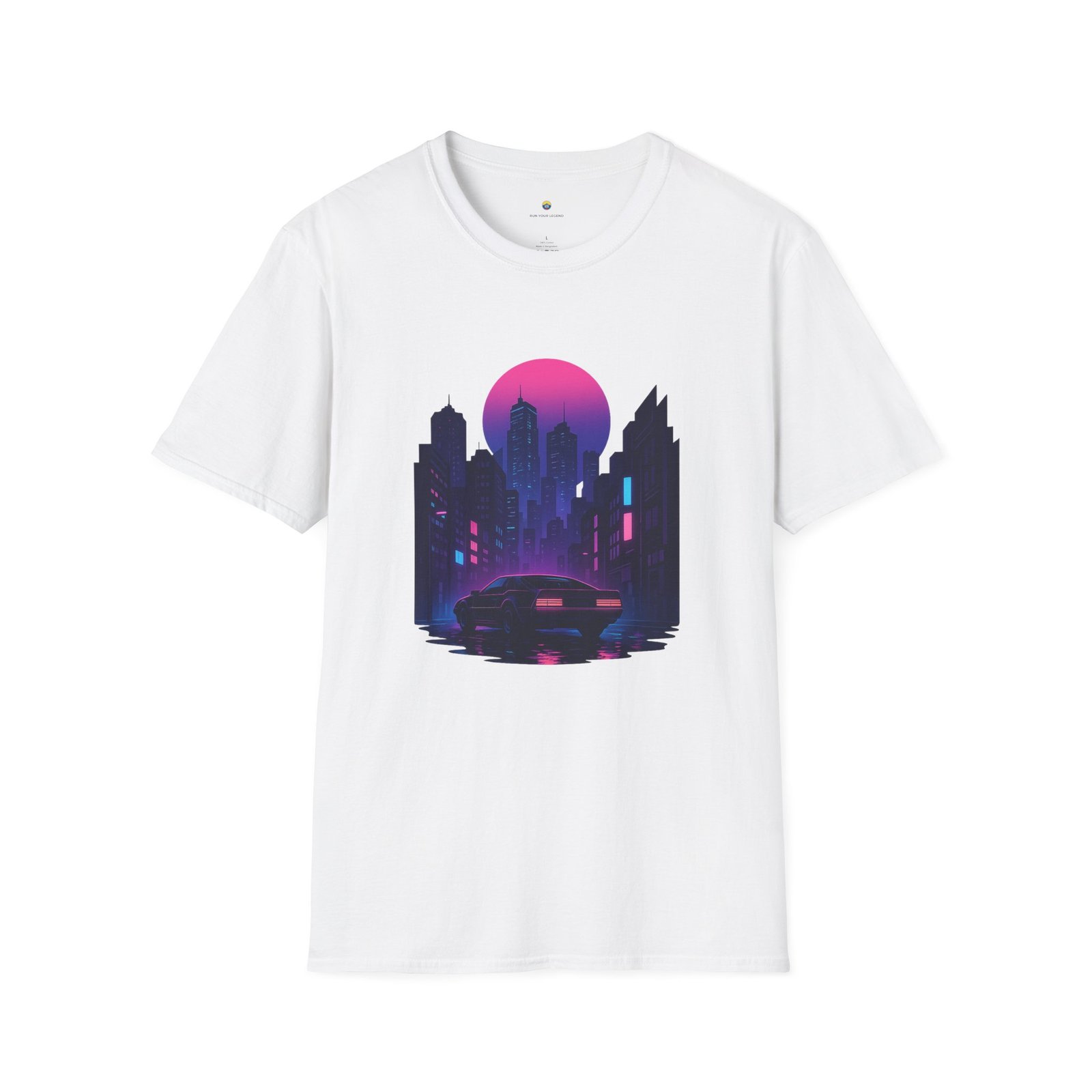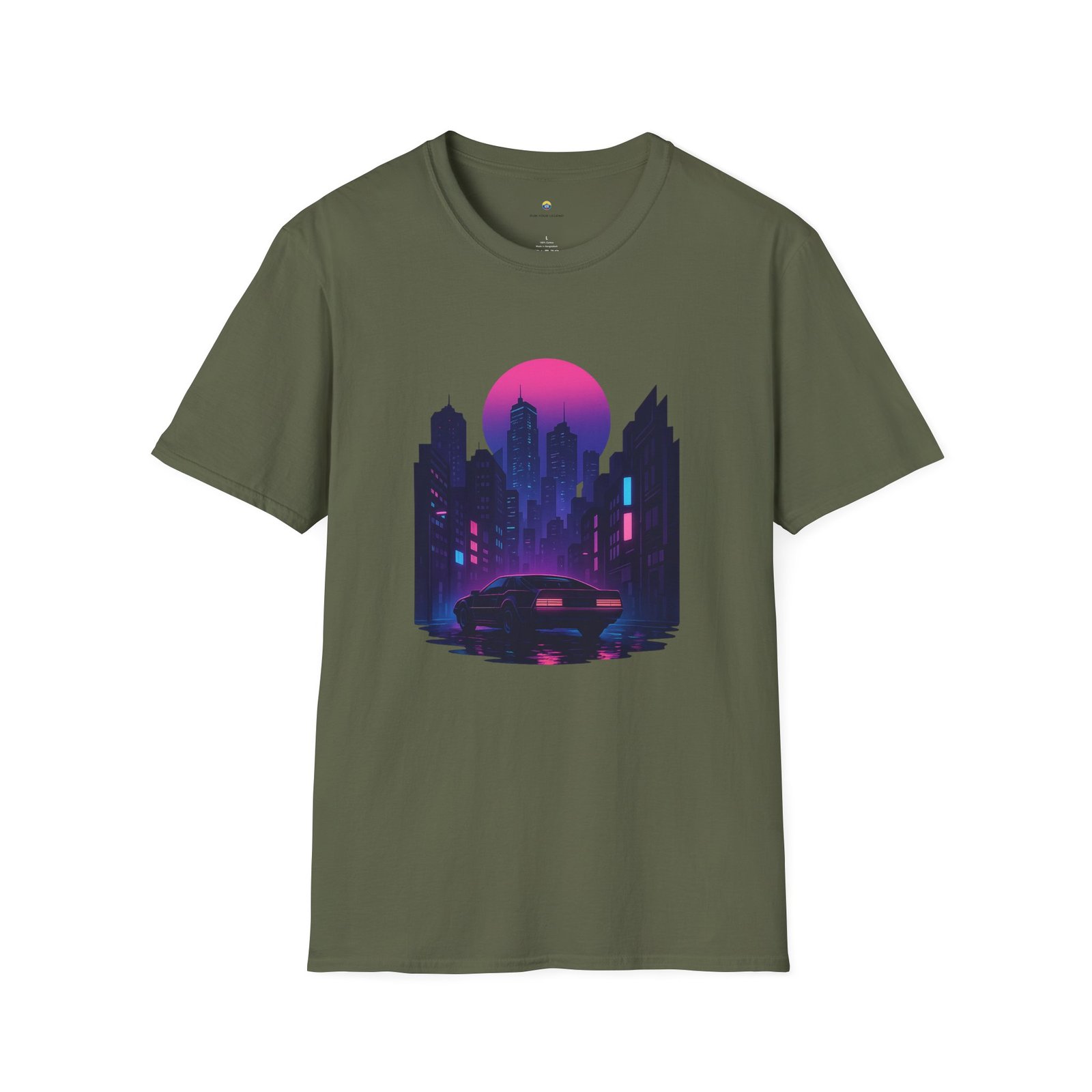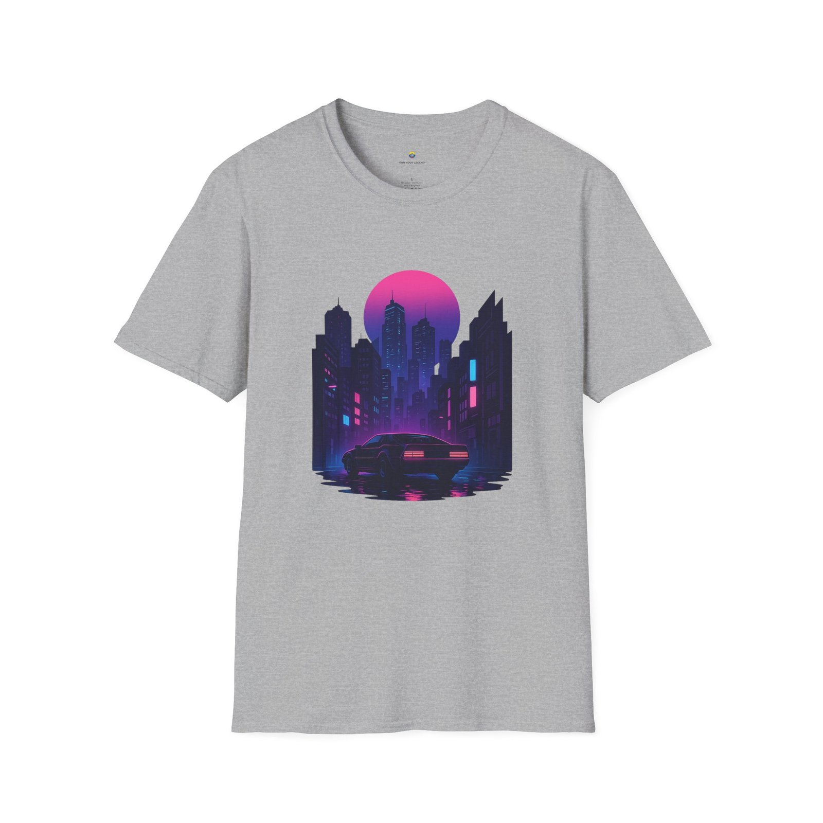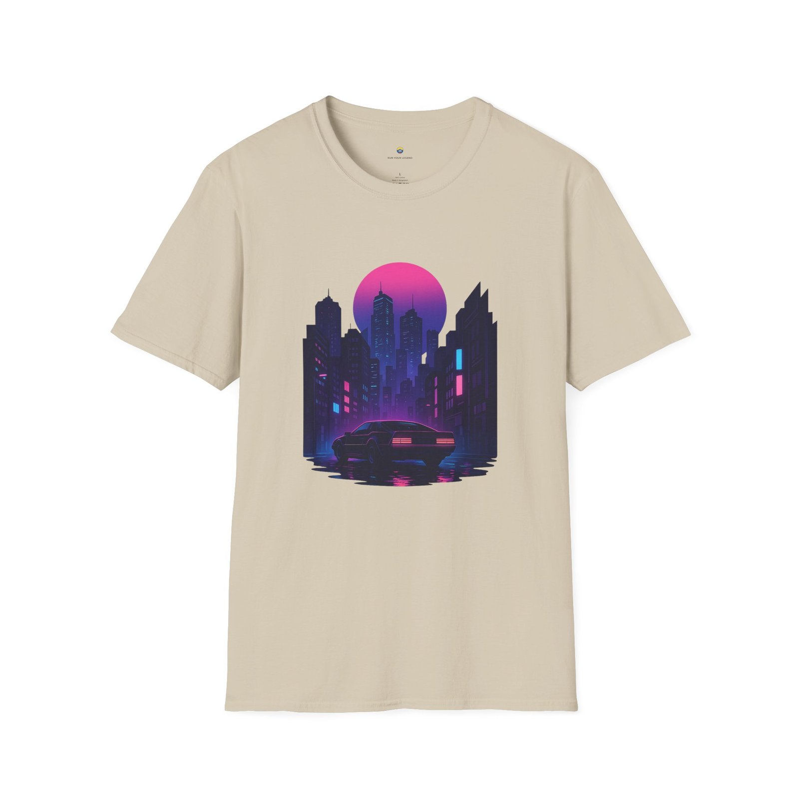 T-shirt Unisexe Cyberpunk Night Drive – Voiture Rétro dans Ville Futuriste Néon