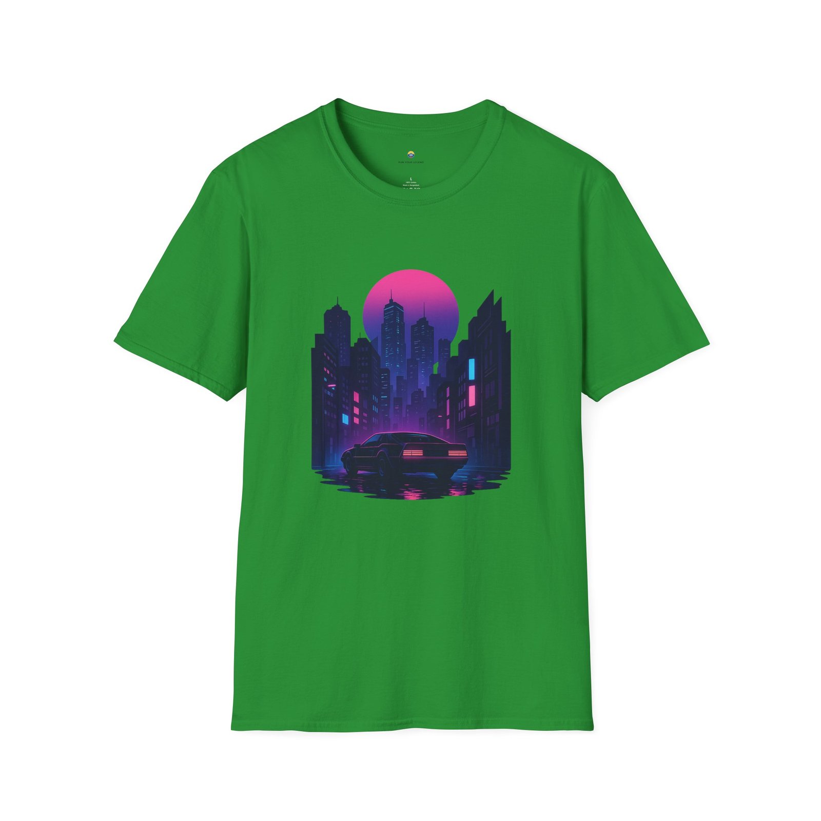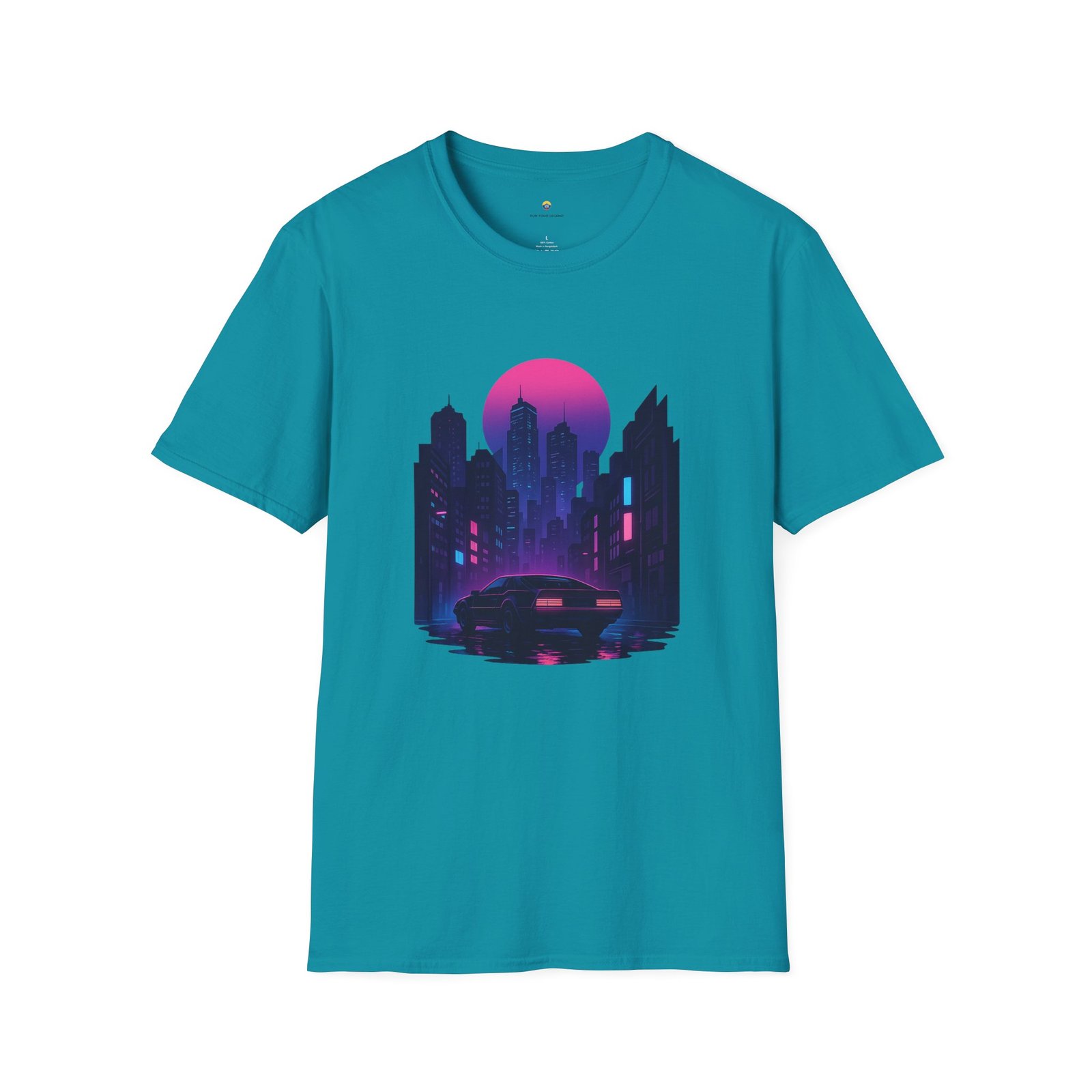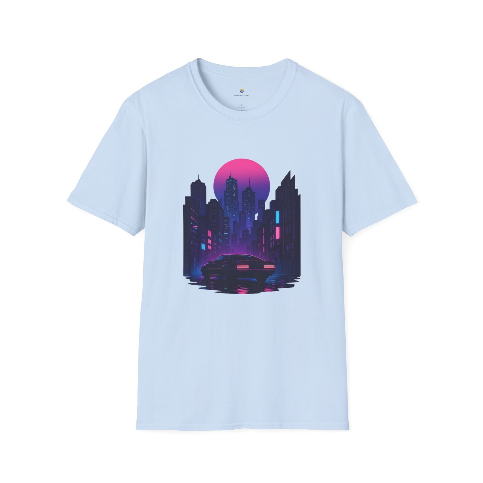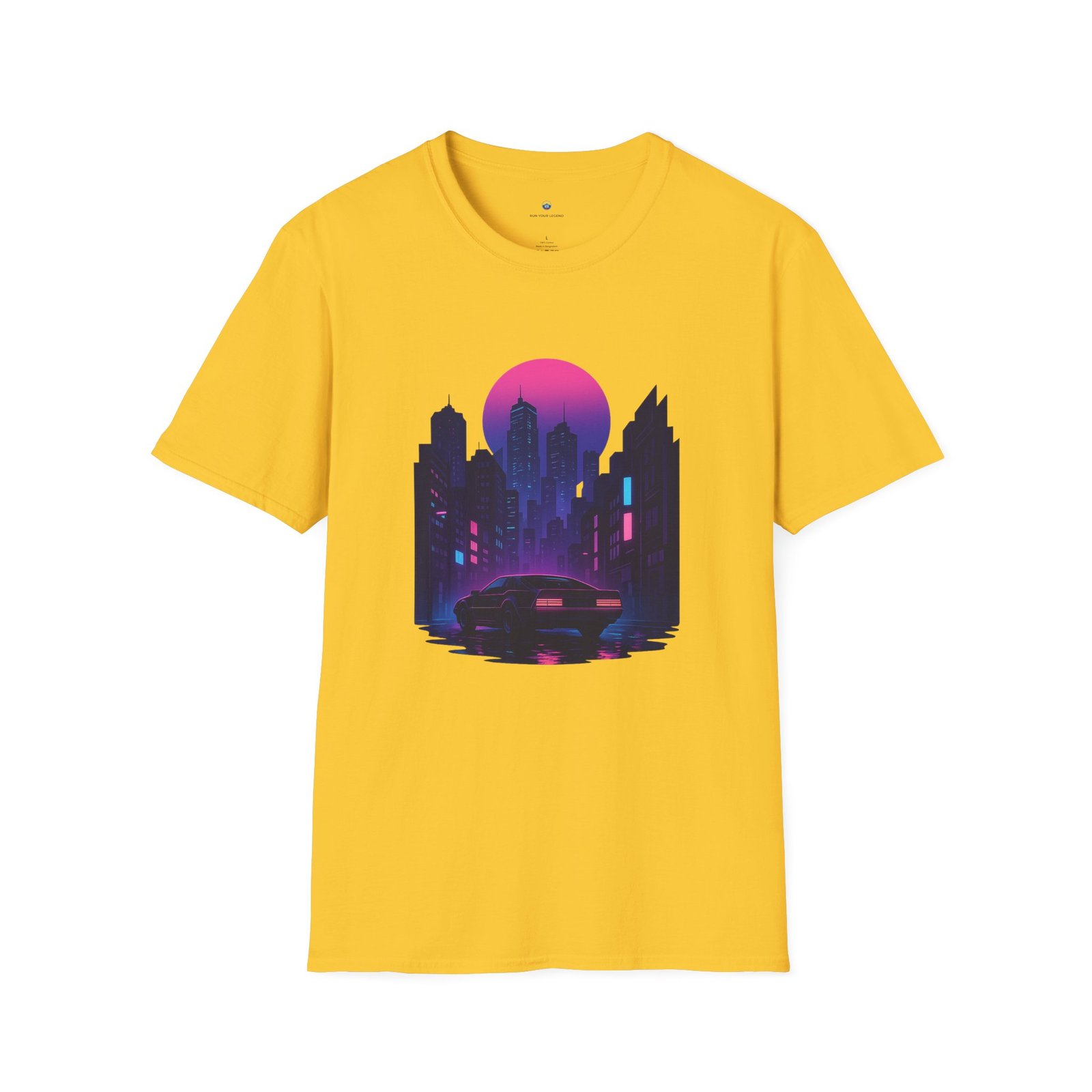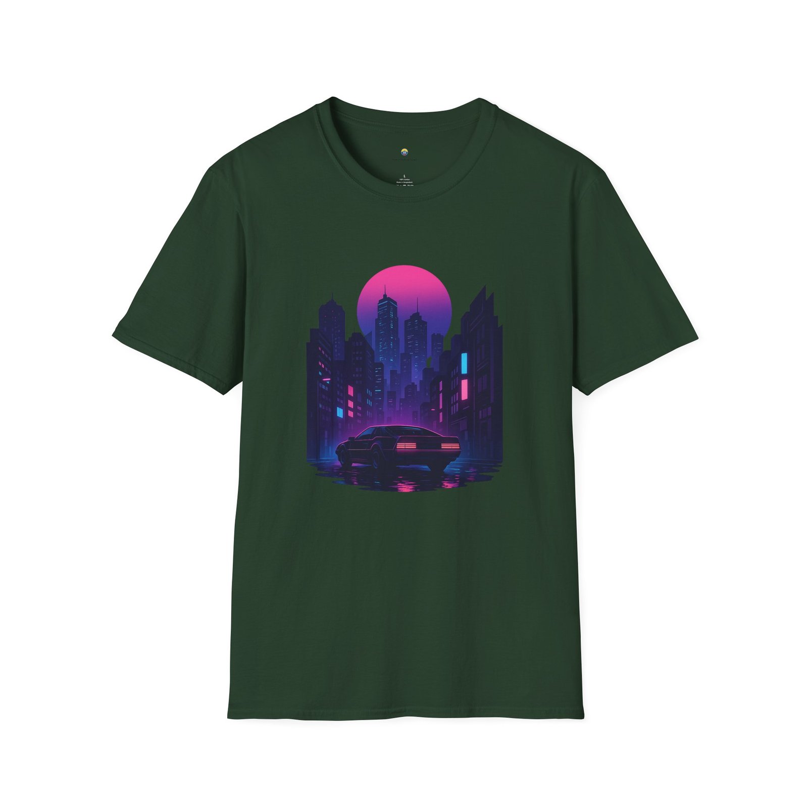 T-shirt Unisexe Cyberpunk Night Drive – Voiture Rétro dans Ville Futuriste Néon