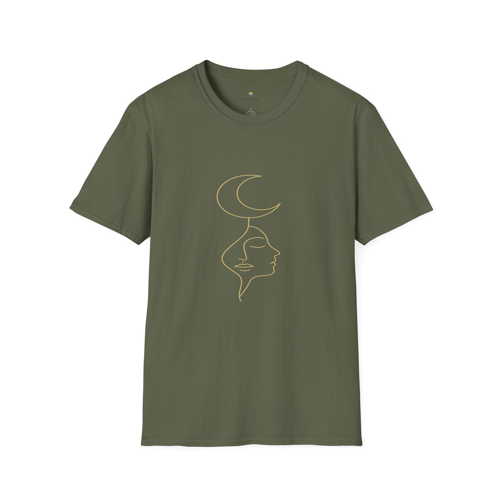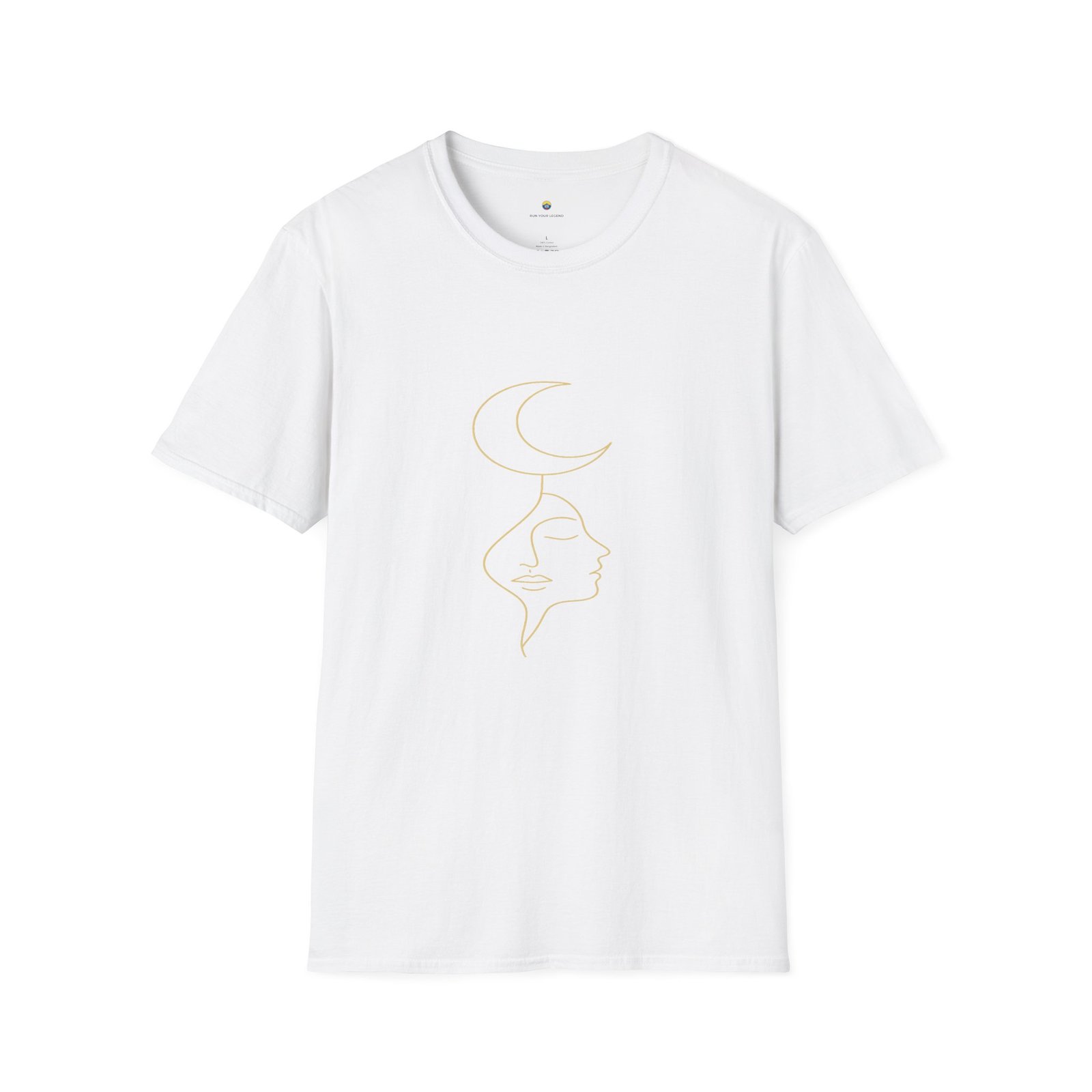 Découvrez le T-shirt Unisexe – Femme Ligne Art & Lune Dorée, un design minimaliste et mystique qui met en scène le visage d’une femme dessiné en une seule ligne, surmonté d’un délicat croissant de lune.