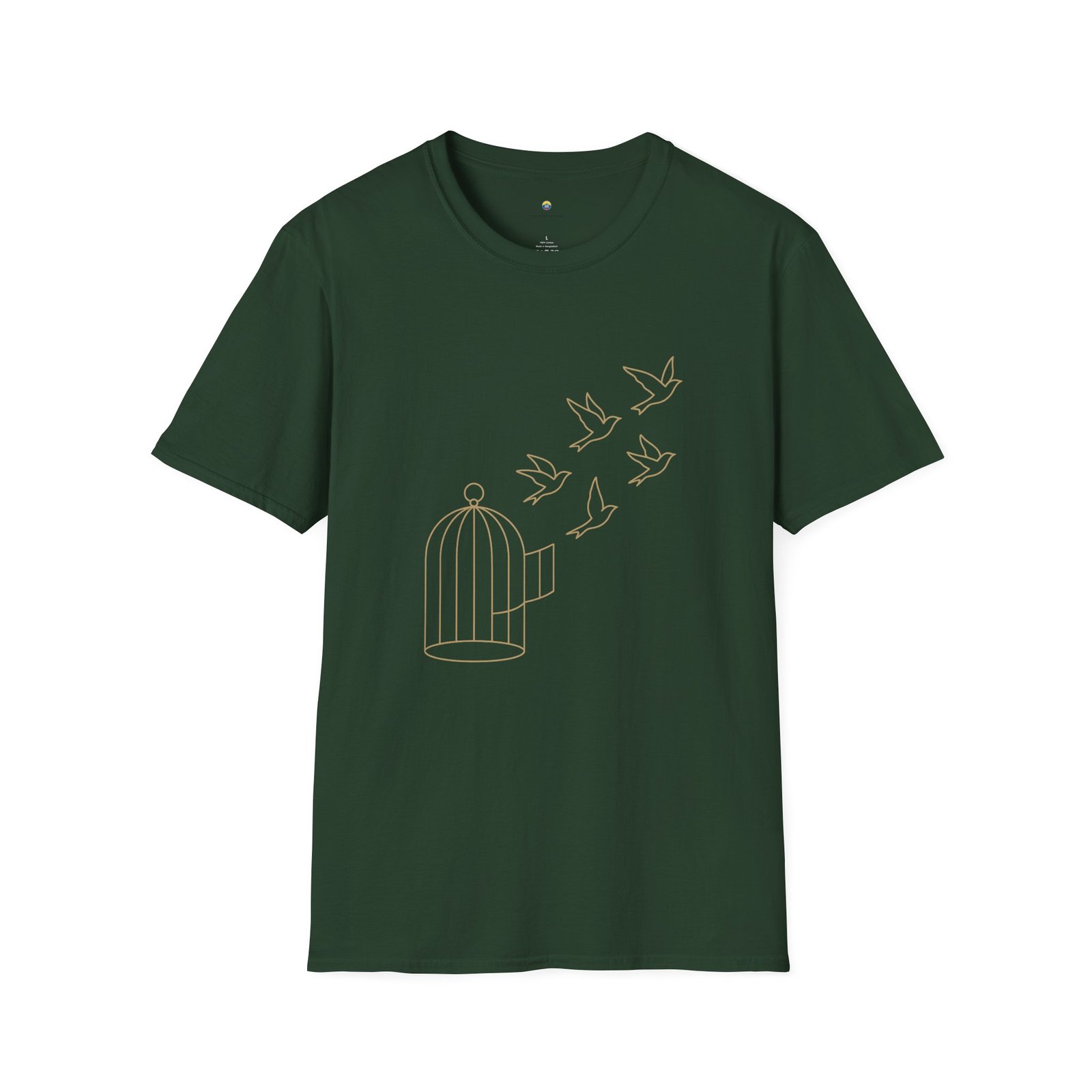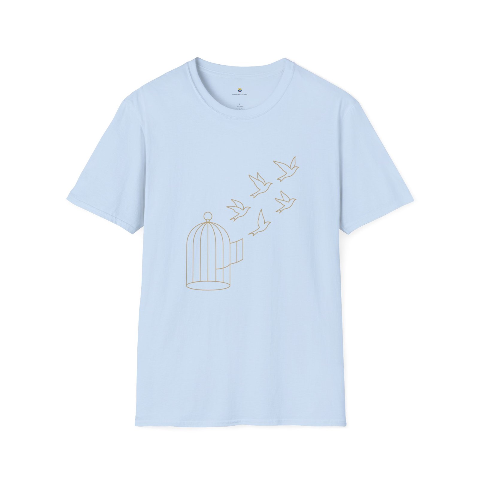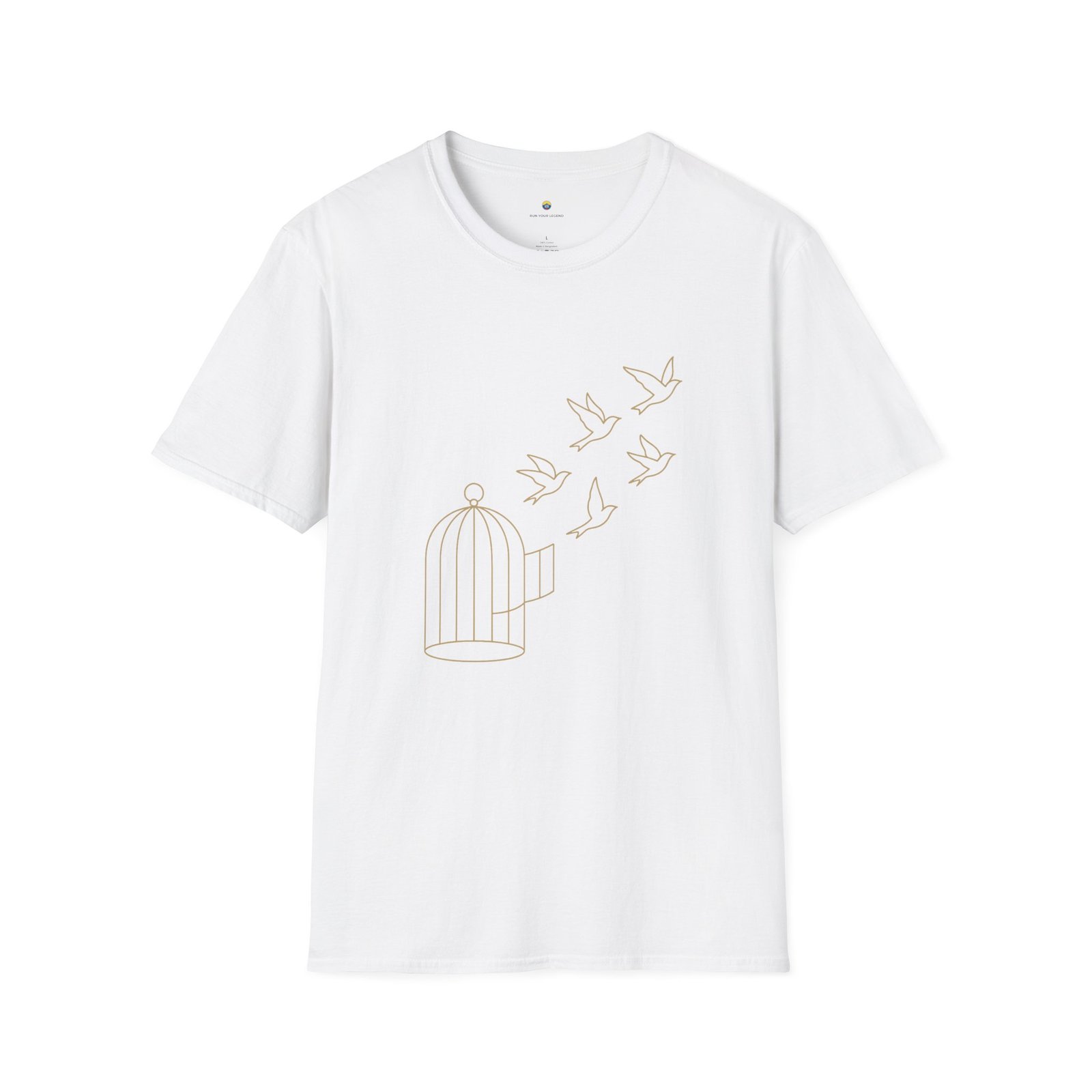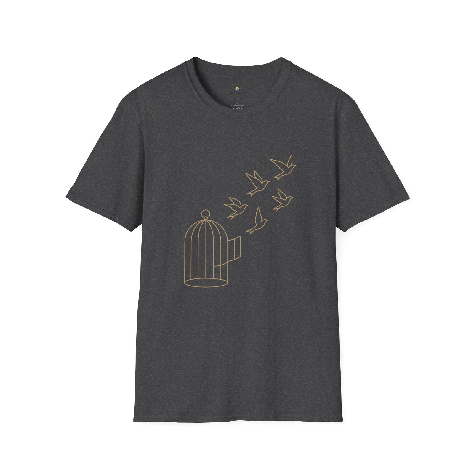 T-shirt Unisexe – Oiseaux Libres et Cage Ouverte Design Minimaliste Doré et Symbole de Liberté