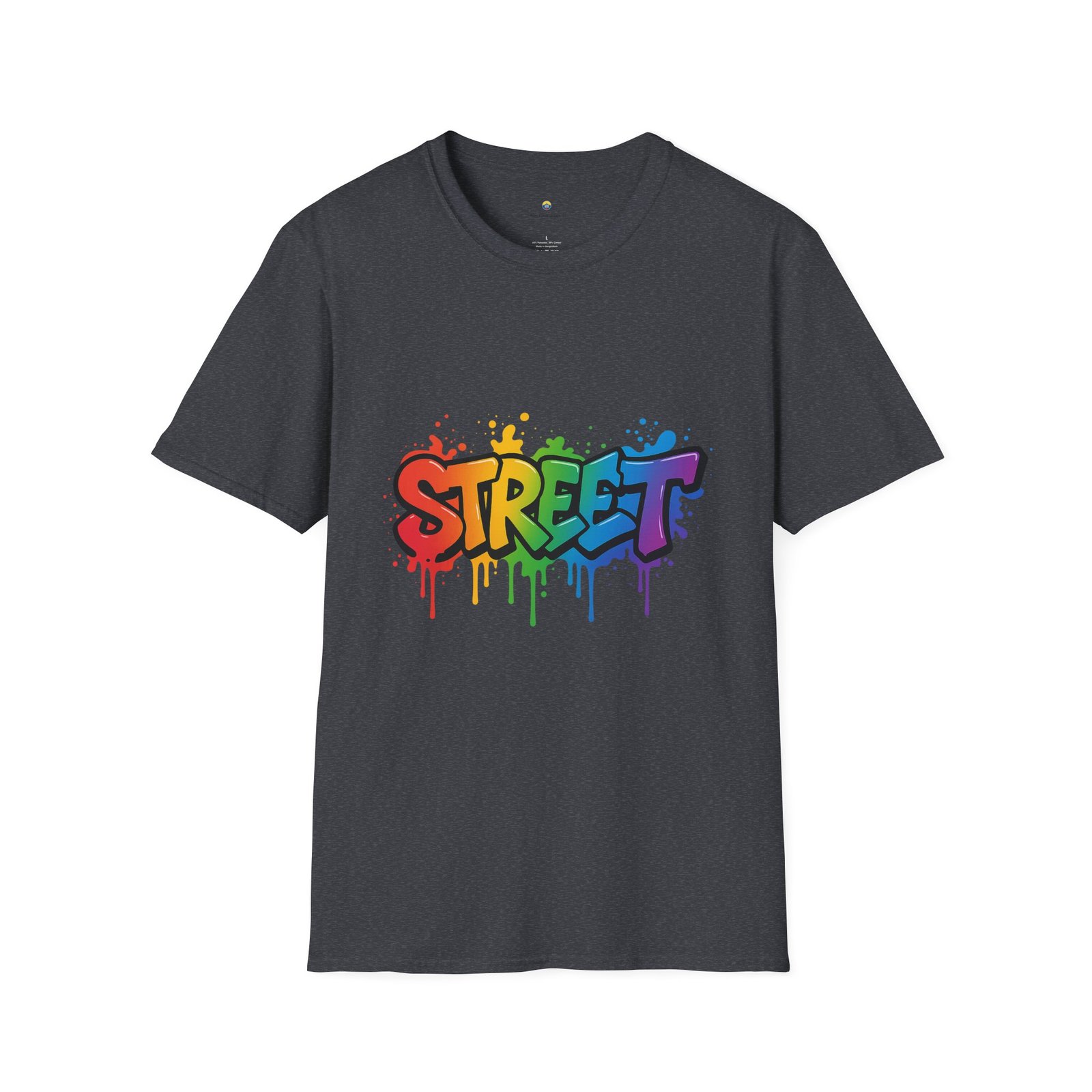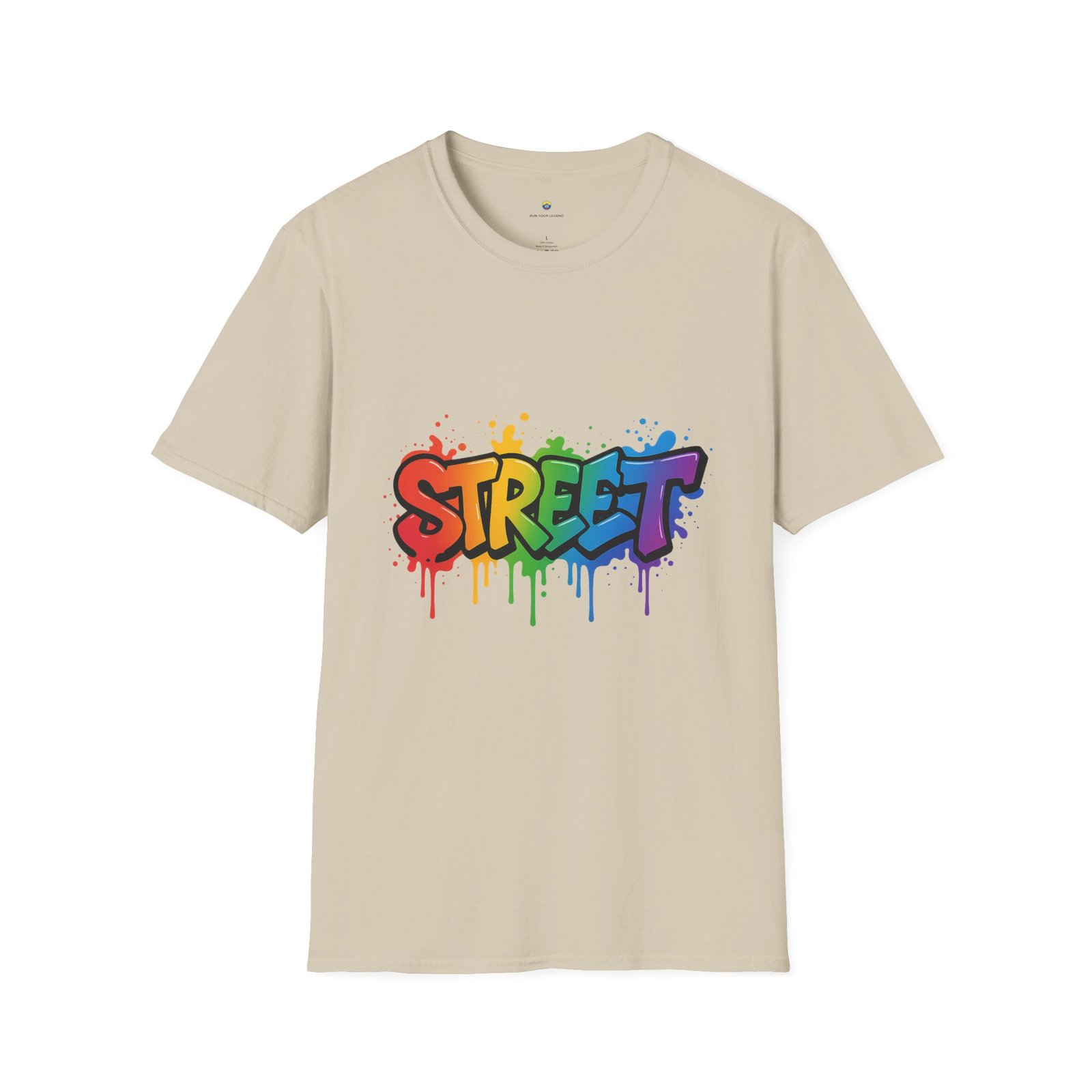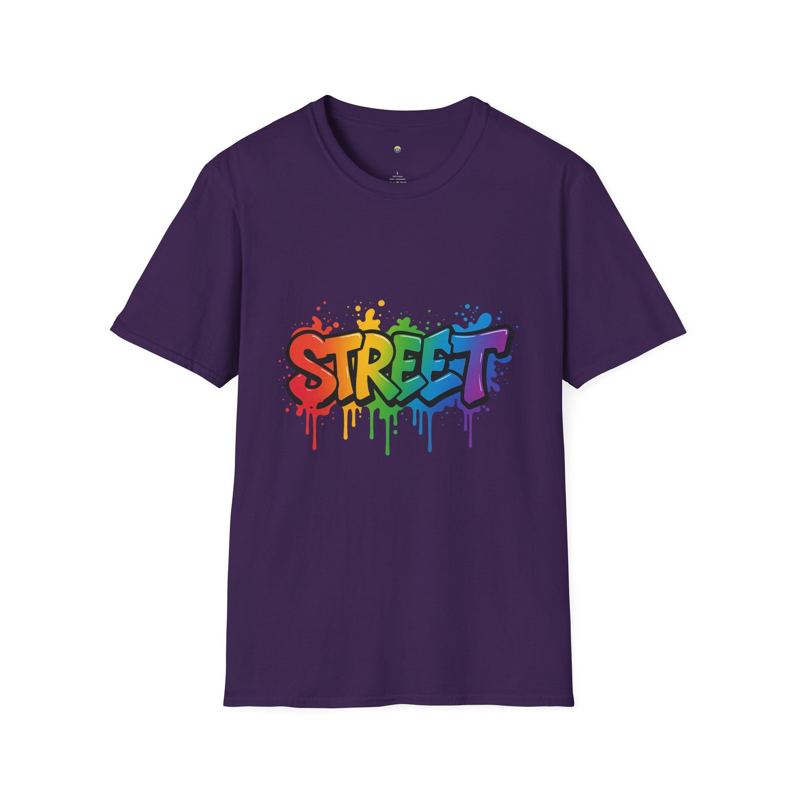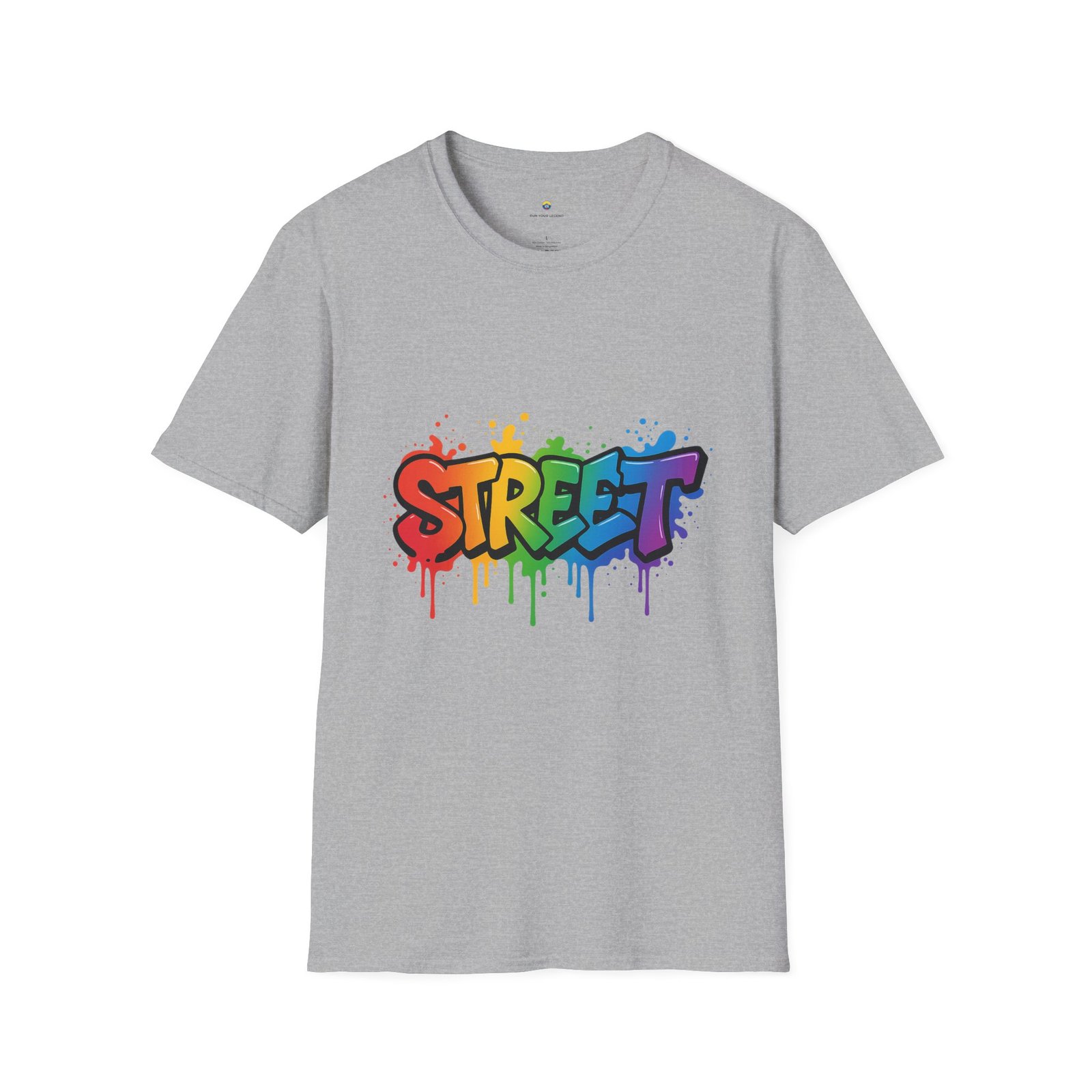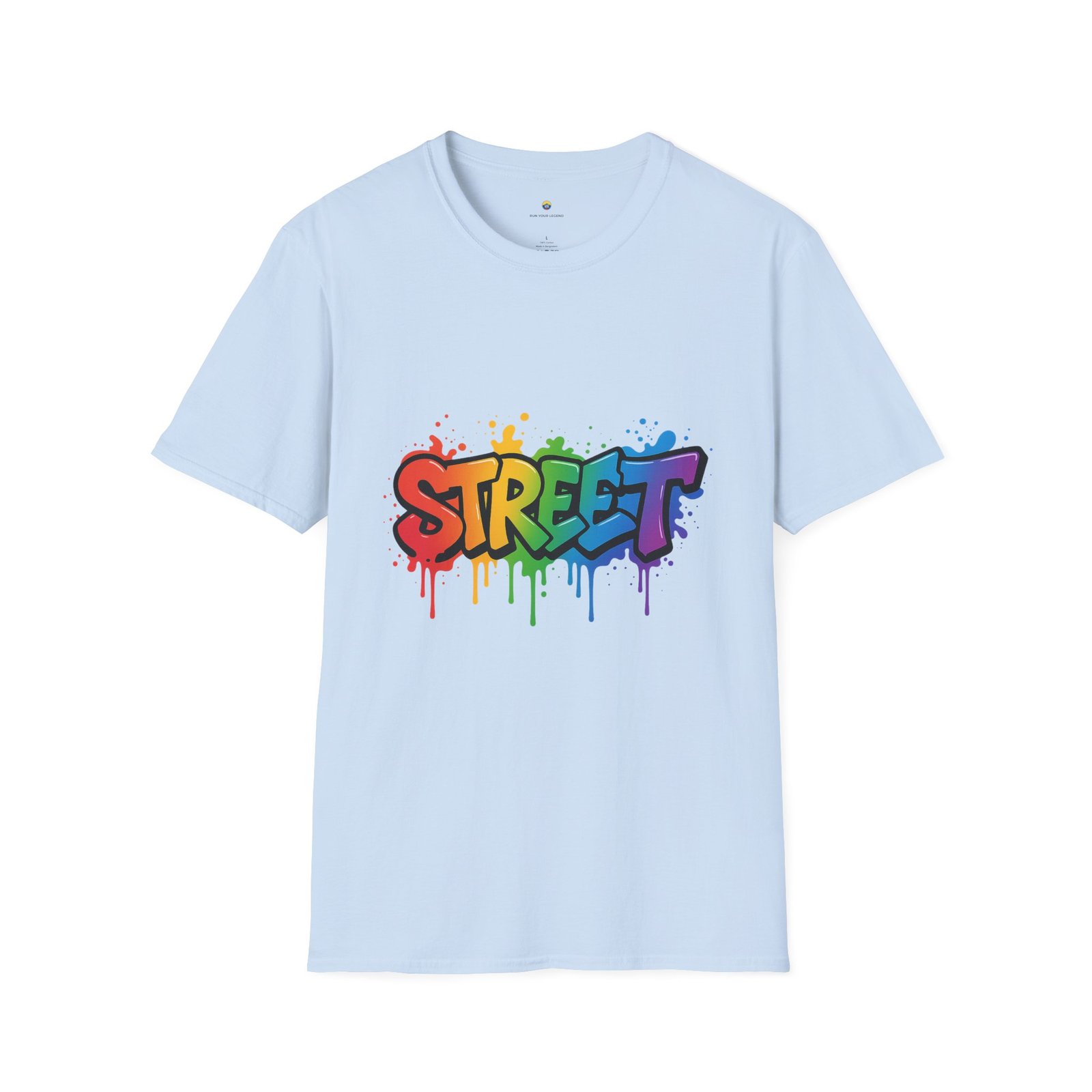 Le lettrage “STREET” en dégradé multicolore, du rouge au violet, accompagné de projections et coulures de peinture, crée un visuel intense et dynamique qui attire immédiatement le regard. Parfait pour celles et ceux qui aiment la mode urbaine, le style hip-hop, les sneakers, le skate, ainsi que les designs artistiques à forte personnalité.